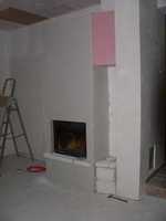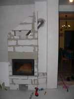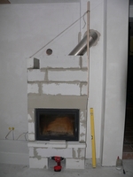 Alsó párkányszintig tégla, rá a betét körbeépítve (tágulási hézaggal) 10-es ytonggal felső párkányig. Ezekhez megvettem a Rath hőálló habarcsot. Ytong felülete és a padló csemperagasztóval glettelve.