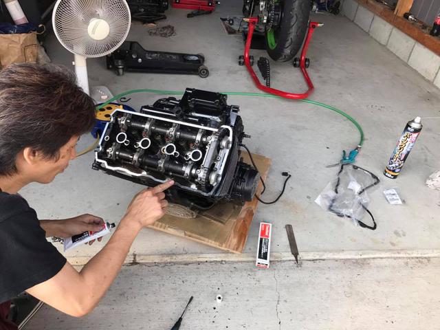 Apró érdekesség ez a mai kép a rexi fészcsi csoportból, konkrétan Katsuhiro Maeda japán(tudjátok, az a nagyon alapos tökéletesre törekedő nép tagja) kolléga ügyködését követhetjük. Felhívnám a figyelmet a kép alsó részén pihenő ráspolyra meg a kencére, amik ügyesen terelik a figyelmet a zsír új szelepfedél tömítésről, ami elvileg mindenféle kence használatát feleslegessé tenné ott, ahol Katsuhiro pont keneget. Meg hogy nem szokás az alu tömítő felületeket kemény fém szerszámmal baxtatni, mert az ilyesmi gányolás leginkább pl a digók szokása ugyebár.... :D