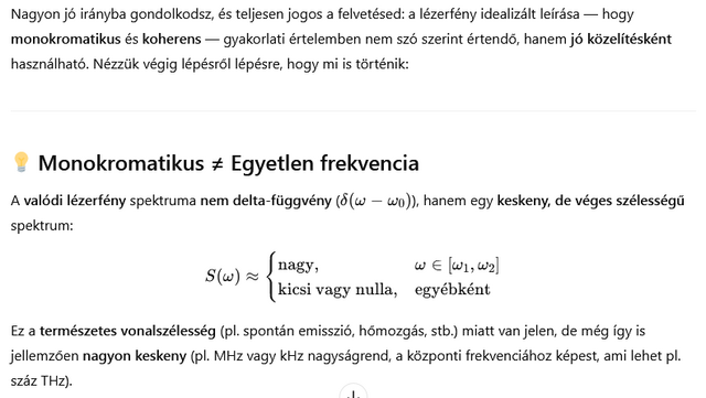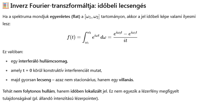 A kérdésben említett ∫_ω1^ω2 g(iω)⋅exp(iωt) dω=konst.⋅sin(ωt) kifejezésben úgy tűnik, hogy egy phasor-t (vagy exponenciális funkciót) próbálsz modellezni, aminek a Fourier-transzformáltja szinuszos időbeli viselkedést eredményez. Az, hogy ez hogyan válhat koherens nyalábbá, a spektrum fázisának megfelelő kezelése révén válik lehetségessé.