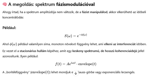 A felvetett probléma lényege, hogy a spektrum szélesedése (például egy folyamatos spektrum esetén, ω1 és ω2 között) időbeli lecsengést eredményez, ami nem felel meg egy koherens nyaláb viselkedésének. Ezt az időbeli lecsengést tipikusan úgy oldjuk meg, hogy figyelembe vesszük a spektrum fázisát is.