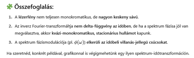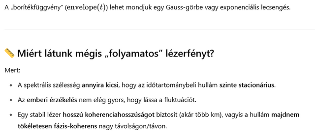 Más szóval a lézer spektruma nem egy konkrét jel Fourier transzformáltja, hanem egy véletleszszerű (de szinuszra hasonlító) jel teljesítmény spektruma. Az inverz Fourier ebben az esetben nem egy időbeli jelet, hanem a jel korrelációfüggvényét adja, amely valóban időben levsengó. Csak ez nem azt jelenti, hogy az időtartománybeli jel ennyi idő alatt lecseng, hanem azt, hogy ennyi idő alatt (a kisugárzást követően) veszti el a koherenciáját. Amit c-vel szorozva adódik a koherencia hossz.