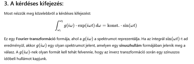 Most nézzük meg közelebbről a kérdéses kifejezést: ∫{ω_1}{ω_2} g(iω)⋅exp(iωt) dω=konst.⋅sin(ωt)