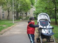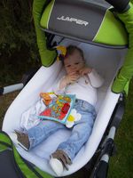 Egy mai kép: A babakocsi csak az én bevásárlásomhoz kell. Nem ül bele, inkább viszi. :)