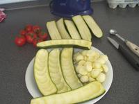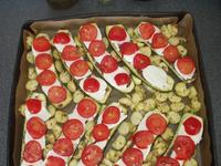 toltelek: a cukkini belsejenek (max.) a fele (aprora vagva) + 200 g daralt marha hus + 2 toljas + 2 evokanal zsemlemozsa + 2 evokanal Parmigiano (frissen reszelve) + mozzarella (kis kockara vagva, vagy akar scamorza, vagy caciocavallo) + bo szerecsendio + so + nagyon keves (extraszuz) olivaolaj