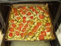 Én úgy csinálom, hogy a megdagasztott+megkelesztett pizzatésztát kézzel szétnyomkodom-szétnyújtom tetszőleges alakúra a sütőlemezen. Kb. másfél-két cm vastagra hagyom. Paradicsomokat kimagozom, felvágom vékonyabb cikkekre, a cikkeket keresztben elfelezem. Fokhagymagerezdeket felszeletelem. Egymástól úgy 2-3 cm-nyire két ujjammal belecsípek a lepénybe, és a "lyukba" bedugok egy kis darab paradicsomot, mellé egy kis fokhagymát. Ezt az egész tésztán megcsinálom. Aztán ecsettel megkenem olívaolajjal, megszórom kevés oreganoval és mehet a sütőbe.