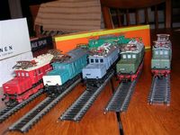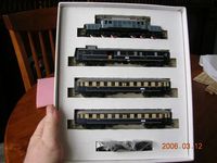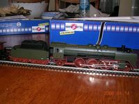 Lyozsy! A képen a Karwendel express eilzug kocsija van. Tipikus DRG-s vonat, vagyis 1945 előtti szerelvény. A DR BR35.10 mozdonya tuti rossz választás hozzá, lévén annak a mozdonynak az első példányát 1955-ben adták át a DR-nek, még BR23.10-ként, és 1970 körül, vagyis már a IV. korszakban lett belőle BR35.10. A BR01-es passzol hozzá, a DRG festésű (Tillig kat. szám: 02120, vagy a zöld 02125), vagy régebben volt a Tillignek E44-ese is DRG-s verzióban, de ma már nincs gyártásban.