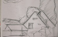 Nekem az a komponálási mód kedves, ami jelen esetben abban nyilvánulna meg, hogy a jobb oldali ház és a fa találkozását veszem fókusznak, az egész, ami a rajzon van, jobbra és lefele mozdul, balra nyílik, fa fölfele meghosszabbodik. Lehet, hogy mindez még azzal is járna, hogy a háttér dombja ellaposodik és balra megnyúlik, a középső, kerekded lombú fa elsétál onnan a fókusz felé, nekimegy a nagy fának, ha nem volnék lusta, leskiccelném.