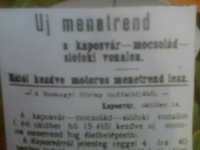 Hányszor elmentem mellette Bogláron pedig..................... :))) Somogyi Hírlap (szerint) 1908 okt.15-én történt: UJ MENETREND... a kaposvár-mocsolád-siófoki vonalon. Mától kezdve motoros menetrend lesz..... Az 1908 jún.11-i újság szerint: Kaposvár-Mocsolád-Siófok. 1, KAPOSVÁRRÓL indul 4312. vegyesv. hajnalban 4.40 Siófokra érkezik délelőtt 10.35 ......4306. motorosvonat délután 4.05 Siófokra érkezik este 8.21. 2, SIÓFOKRÓL indul 4305. motorosv. hajnalban 3.20 Kaposvárra érkezik reggel 7.27 ......4313. vegyesvonat déli 12.41 Kaposvárra érkezik este 7.00. Ha érdekel majd elolvasod, mert az egészet nem tudom ide írni. Nagyon érdekes csatlakozások voltak a siófoki vonatokhoz!!!