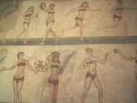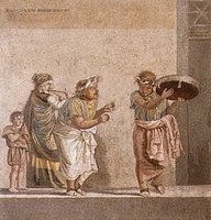 ''The mosaic of the street musicians illustrates a scene from a play by Menander. Followed by a dwarf, a woman accompanies on her flute the dance of two men, one of whom plays the cymbals while the other beats a frame drum.'