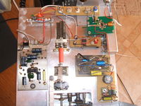 Ez, bár tutira kizárod, de lehet, hogy mégis egy 400 MHz-et is magába foglaló sávra készült erősítő. A felső skála 400-at mutat, az alsón 500, 400 és 3.. látható. Az egység felső részén jobbra van a hangolás meghajtása a skálával. Ez a cső rácsának illesztő egységét hangolja, amely illesztő ettől balra van, és két, egymással leágazáson keresztül csatolt tekercset tartalmaz. A hangolás az ezek belsejében mozgó fémdugóval történik. Ezen hangoló egység át van kötve egy fémlemez falon át a csőfoglalathoz. A foglalatot tartó lemeztől balra van a cső, amelyet egy szigetelő rúd szorít le és ezen keresztül történik az anód csatlakoztatása. Az anódfeszültség az ez alatti tárcsán át jön föl az alsó részből. Alul látható az anódfeszültséget átvezető kék átvezető kondi, az ezzel párhuzamos sárga alkatrész, ami valszeg egy további stopping. Innen indul felfelé, a cső anódja felé egy tekercs, aminek a vége átbújik a vízszintes lemezen. Az anód a könyökön keresztül egy koax. rezonátorhoz csatlakozik. Ennek köpenye felhasítottnak látszik, így csatlakozhat, mintegy leágazásként a kimenet. Ezekből a képekből nem derül ki, hogy hol és hogyan oldották meg az egyenfeszültség leválasztását a cső és a rezonátor között, talán a belső eret alakították ki csatoló kondenzátornak. Azt mindenesetre meg kell állapítani, hogy ötletes a konstrukció.