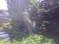 Most egy nagy 5 méteres fenyő és egy majdnem ekkora smaragd tuja mögött van, fölötte meg egy öreg köretfa ad árnyékot.