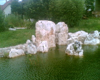 Vízesést tervezek. Felső kő már adott, ilyesmi elrendezés nálam is jól mutatna. Csak ezt a képet találtam, nem látszik jól. A domb (Fuji:-) tó felé eső déli részén szeretném a vízesést kialakítani. Mohák csak álom maradnak. :-( (persze a méretek is elmaradnak.)