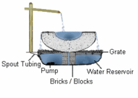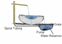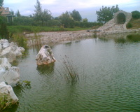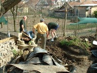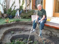 Alapvetően magam akarom készíteni. Köveket, növényeket meg mindent régóta gyűjtöm, ami a legjobb, egy mezőgazdasági boltban sikerült venni egy műanyag medencét ami tökéletes a kő alá gyűjtő medencének. Nagy zöld, erős műanyag monstrum, középen egy kiemelkedő oszoppal -ez segít tartani a nagy követ-, egyik oldalán levágva a körszelet, itt lehet letűzni a bambuszt. Furcsa alakú, egyáltalán nem tudták mire való, volt vagy egy tucat nekik. Az oldalán lévő írásokból rákerestem interneten, egy angol házi vízellátó rendszereket gyártó cég terméke, egy komplett házi szennyvíz rendszer egy speciális eleme. Hogyan került ide? A japán teapavilon egyik sarkában helyezem majd el. Egyelőre a pavilon beton alapja áll, és az év hátralévő részében sem fogok tudni kertezni.