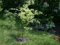 Gyanítom, hogy az Acer palmatum, az alábbi képen a napsütésben sárga - egyébként sárgászöld színű fácska. Őszig talán zöldül még egy kicsit, az őszi színeződésére én is kíváncsi leszek. Mögötte egy 'Dissectum' simul a fűbe, valamit ki kell találnom alá, valszleg egy kupac Vincsa major 'Variegata' lesz a megoldás, mert a szeldelt lombja tökéletesen fűszínű, és csak akkor veszi észre az ember, hogy ott egy palmatum, mikor már egy méterre megközelítette... ;-)