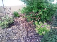 A vörös levelű valami, ami bírja a napot akár egy szeldelt fekete bodza is lehetne, az még virágzik is... :-) Vagy egy cserszömörce, ugyanezt tudja, vagy ha találsz valahol Cercis canadensis 'Forest Pansy'-t, kis fának ideális, ő aztán kifejezetten napra való, lombsátor alatt ahogy néztem, nem vörösödik...