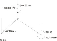 A rajzon azt láthatod, hogy az Rt. század felderíti a légicélt 45o 100 km poláris koordinátákkal. Viszont ugyanezen légicél poláris koordinátái a feladatot kiadó dandár harcálláspontról nézve már 180o 50 km. Ugyanez a repülő a rakéta osztálytól nézve már 300o 150 km. Végül is lehetne ezekkel az adatokkal számolgatni, de az a lényeg, hogy az Rt. századhoz viszonyított poláris koordinátákat először a dandár harcálláspont álláspontjához kellene viszonyítani, hogy egyáltalán tudják, hol van. Nekik a századtól mért poláris koordináták nem mondanak semmit. A rakéta osztálynak meg pláne nem.