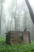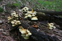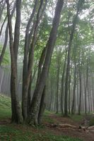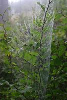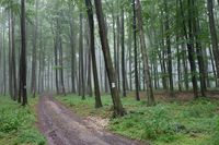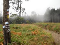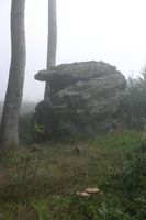 "Kápolnától lehaladok a kék pöttyel jelölt úton megyek de csak az erdészeti útig, azon balra mindig nyugat felé amíg el nem érem a P jeleket. Illetve egészen pontosan kicsivel előtte átcsapattam az Asztal-kőhöz, a gerincen pókhálókra kicsapódott köd, a ködben tanyázó misztikus szikla, előtte két őzlábgomba, nagyon szépek voltak így együtt.