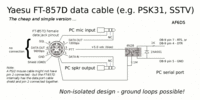 Ha csinálsz egy kábelt (kapcsolási rajz a csatolt képen), ami a rádió data (tehát nem a CAT) portját köti össze a pc hangkártyájával, kiválóan működik. Én még annyival is kevebbet csináltam meg ebből a kábelből, hogy a PTT vezérlést be sem kötöttem, csak az IN és OUT-ot, és a PTT-t a Ham Radio Deluxe-ban úgy állítottam be, hogy VOX által PTT-zik. Ehhez a rádio 40-es menüpontjában a DIG VOX értéket állítsd mondjuk 50-re. Adáskor a hangra automatikusan fog PTT-zni a rádió. Maga a kábel nem a legelegánsabb megoldás, mert nincs galvanikusan leválasztva a pc a rádióról, de tökéletesen működik. Amúgy neten is lehet rendelni ugyanilyen kábelt, 3-4 ezer forint, de ha megveszed a 2 sztereo jacket meg a 6 tűs mini-DIN-t, akkor megúszod 500 Ft-ból. Ez persze a tuner vezérlését nem oldja meg.