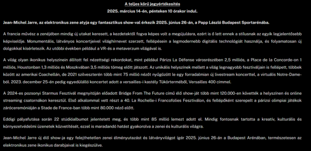 Tényleg nem olcsó, az egyszer biztos. Nekem persze már megvan a jegy, azért kicsit kínos lenne, ha ilyen Jarre rajongás után a leghátsó sorból nézném, viszont nekem annyi előnyöm van, hogy tavaly már láttam első sorból egy Jarre koncertet, az az élmény már megvolt, hogy pár méterre tőlem játszik a Jarre és két társa, ezért most nem is baj, hogy nem az 50 ezres színpad előtti jegyeket vettem, most egy kicsivel hátrébb lévő, inkább a fényjátékra koncentráló jegyekkel is beérem, az sem olcsó, de még a maximum határon van, amit erre rá merek szánni. Egyébként azt hozzáteszem, hogy így is közelebb leszek, mint 2 éve a DM-on, pedig ez alig pár ezerrel több, mint az akkori, sokkal hátsóbb jegy. Elhiszem, hogy a DM népszerűbb előadó, de azért 2 éve még nem ez volt a gazdasági helyzet globálisan. 77 éves Jarre és 10 éve volt utoljára itt, én vagyok vele, hogy 95%-os eséllyel utolsó koncert a kedvenc előadómtól, amin még ott lehetek.