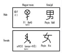Jópár éve már jeleztem a kínai "férfi" jelének és a magyar férfi "FI" rovásjelének (ligaturájának) hasonlóságát.