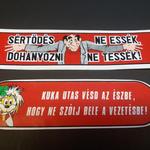 Nekem is csak a kukucskáló szörnyecske kapaszkodó újakkal matrica van meg az emlékezetemben. Az utastéri matricákból pedig a "kuka utas..." és "az ajtót és a sofőrt..." kezdetűekre emlékszem.