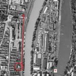 jobbra a szentendrei HÉV vonal óbudai szakasza az egykori szeszgyár felé nézve, balra itt ma a Gyarmati Dezső park található. Jobbra a síneken túl Gróf Esterházy János (Óbudai) rakpart van.