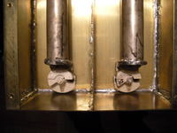 A tető kétoldalas nyáklemez, felülre forrasztva egy nyolcas anya, alul egy kb. 15 centi hosszú, 10 mm átmérőjű vörösréz csődarab. A menetes szár hajtja a sárgaréz dugattyút.