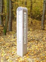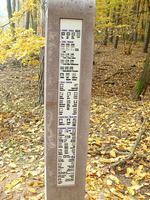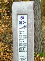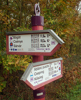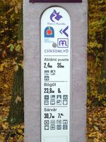 Ami meglepett, az a logisztika: pontosan felmérték a távot, feltérképezték a települések szolgáltatásait és mindezt nemzetközileg is közérthetően rendelkezésre is bocsátják. Előnyös a kialakítás is: a betonoszlopot (gondolom, vasbeton) nehéz tönkretenni, ha pedig a műanyag táblarészt rongálják meg (lefújják, leszakítják), a meglévő sablon alapján könnyű utángyártani (talán van is belőle tartalék). Egyetlen kifogásom van csak ellene: anyaga miatt nem illik az erdőbe, de persze így a praktikus.
