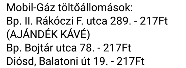 TARTÓSAN ALACSONY LPG ÁR! - 50.HÉT Mobil-Gáz töltőállomások: Bp. II. Rákóczi F. utca 289. - 219Ft (AJÁNDÉK KÁVÉ) Bp. Bojtár utca 78. - 219Ft Diósd, Balatoni út 19. - 219Ft (Az árváltoztatás jogát fenntartjuk!)
