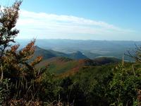 A vadászház után kezdődött aztán a kaptató meredekebb része. Először vagy száz métert emelkedett az utam a Kakas-bérc gerincére, itt kifújtam magam, aztán tovább, fel a Nyársasokra. Nyolcszáz méter felett értem el azt kis kőfolyást, amint öt éve is kisétáltam Gáborral a kilátópontra. Most is végigmentem rajta, aztán leültem gyönyörködni a kilátásban!