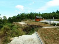 Beugrottam pecsételtetni a gibárti vízierőműhöz, aztán visszatértem egy sörre az út mellett álló presszóba, utána pedig átkeltem a Hernád hídján. A feljárójáról lenézve láttam, hogy egy nagyobb kenus csapat vert tábort a híd melletti tisztáson. Nagyon jó hangulatban voltak már kora délelőtt is! Nem úgy nézett ki, mint akik nagyon készülődnének az induláshoz, inkább a bográccsal voltak elfoglalva, meg sűrűn emelgették a sörös flaskákat is! Felkaptattam a túlparton a kis szerpentinen a folyó feletti dombhátra, itt az egyik kanyarban egy kilátópontot hoztak létre sétányokkal, parkolóval és padokkal, szépen le lehetett innen látni ugyanis a folyóra. Azonban egy nagy súvadás szinte az egészet tönkretette! A löszös partoldal több száz lépésnyi szakasza csúszott meg, úgy láttam, a következő menet akár már az országutat is viheti!