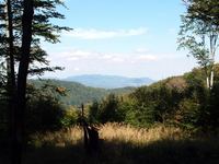 Egy kisebb, de egy szakaszán meglepően meredek emelkedővel felértem a Vágáshuta és Nagyhuta közti domb ligetes tetejére, innen már szép volt visszafelé tekintve a kilátás a magam mögött hagyott Sátor-hegyekre. Körülnéztem, aztán egy szerpentinszerű földúton leereszkedtem Nagyhutára.
