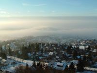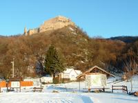 A völgyben még köd volt, de ahogy ballagtam egyre feljebb a faluban, kiértem a napsütésre, a vár alatti parkolóban már ragyogóan sütött a Nap! Felkaptattam a várba, megnézni a kilátást – ami a nullával volt egyenlő, de az a nulla, az fantasztikus volt! Kis pihenő után kilenc felé veselkedtem neki a Vár-völgy kaptatójának, egy lendülettel felszaladtam a Határnyiladék aszfaltútjáig. Fenn a fennsíkon 10-15 centis masszív hótakaró fogadott, előttem két lábnyom húzódott csupán a hóban, de később azok is másfelé tértek. Ennek ellenére meglepően jól járhatóak voltak a nyiladékok, a jelzések is megfelelőek voltak, nem is kellett sem a térképre, sem a GPS-re nézni, jól követhetőek volt a hóban szinte láthatatlan utak.