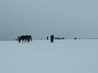 Az erdei aszfaltúton sok teherautó járt előttem, keményre volt taposva a felülete, itt ért utol egy kocogó! Rajta kívül egy teremtett lelket sem láttam Csókakőtől Gántig! Sajnos útközben befelhősödött az idő, később a köd is leszállt, beszürkült a világ. A Hajdúvári vadászház környékén kissé besűrűsödtek a lábnyomok, de az Antal-árokba ereszkedve már megint szűz hóban jártam. A hegyek közül leérve rátértem a Kápolna-puszta felé tartó jól kitaposott keréknyomokra, ezeken ballagtam egészen Gánt határáig.