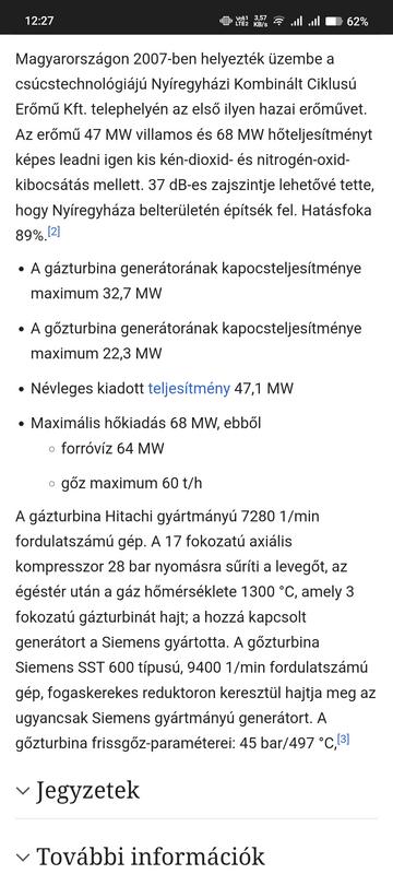 Elolvastad azt amiből idézel? Ha igen akkor le kellett jöjjön hogy az 2 db turbina. Az egyik gáz turbina amelyben mondjuk földgázt égetnek és a másik pedig az első turbina kipufogógázával hevített gőzzel hajtott turbina. ..és ez ahogyan leírtam úgy elméleti 70% de annál némileg azért kevesebb. Majd a lecsapódó gőzt amely lehet úgy 70-80 fokos, beeresztik a központifűtés (+központi hmv) hálózatba és így szummában 70% fölötti a hatásfok (lehet akár 85 is). De turbinánként ez továbbra is csak 35% hatásfokot jelent. :D ..és Fargo fogalmazta meg jól egyszer amikor már volt ez téma, hogy ez a fejlettségünk azon szintjén, ahol a már a Mars kolonizációját készítjük elő, nagyon elmaradott módja az energia előállításának.