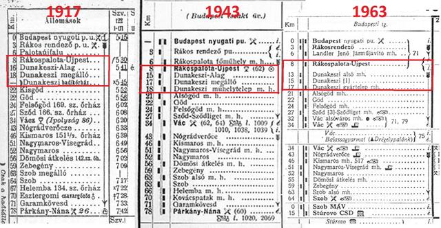 Ebből az jön le nekem, hogy a Rákospalota-Újpest állomástól eleinte 8, majd 7 km-re levő állomás volt Dunakeszi-Alag és ez ma Dunakeszi állomás. A mára már megszűnt Dunakeszi megálló pedig a mai állomás és a Dunakeszi gyártelep megálló között volt.