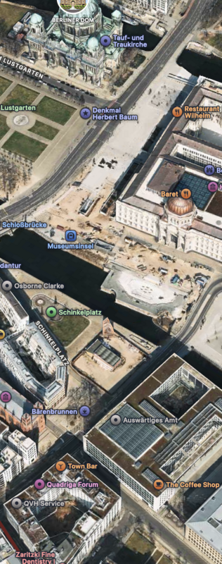 a Spree túloldalán a Zeughaus (ma: Deutsches Historisches Museum, hátrébb a Ministerium für Auswärtige Angelegenheiten der DDR (az NDK Külügyminisztériuma) mára már elbontott épülete