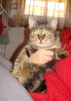 Kórházudvarból mentettem a biztos rossz sors-halál elől. Ahogyan az lenni szokott; ő is kidobott cica, akinek semmi bűne nincsen - sőt, egyenesen nem lehet nem beleszeretni! Extrém kedves, bújós, hangosan dorombolós (a falak szinte zengenek tőle), ágybanalvós, ölbe mászós. Úgy kapaszkodik fel az ember ölébe, mint egy kisgyerek. Teljesen hozzá van nőve az emberhez. Rendkívül ember-centrikus, és hálás, minden pillanatban kifejezi háláját a megmentéséért. Bent van tartva, szobatiszta, problémamentes, gyerek, másik cica, kutya mellé is örökbefogadható. Várja méltó gazdiját ez az igazi Kincs!