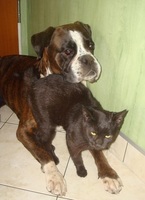Egy tündéri, szintén mentett dajkacicával közösen nevelgetjük. Nagyon édes, játékos, dorombolós, ember-centrikus, macskabarát kutya, másik cica mellé is örökbefogadható (szeretne társat magának).