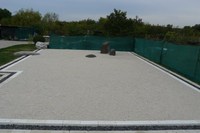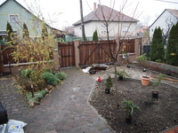 Kérdésedre válszolva. A követ Budán vettem. Máshol csak 10kg-os kiszerelés volt horror áron. Itt a telep alsó sarkában egy megviselt big-beg zsák aljában bukkantam rá. Igy sem volt olcsó -durván fele mint máshol- de úgy megörültem neki hogy szinte az összeset elhoztam (kb. 3q). Egyébként ahogy a képen is látod 5-7 cm vastagon van, alatta műanyag rács. Részben azért hogy kevesebb kavics kelljen, részben mert ez a ház csapadék elvezetője is. Így gyorsabban lefolyik a víz.