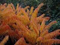 Az ecetfa színe nagyon szép a tiger eyes nem is narancsos inkább tűzvörös. Egy budai kertészet előtt van kiültetve egy kékes-zöld levelű kis termetű ecetfa nem szőrös az ága és a termése is egy kicsit más. Némi érdeklődés után kiderült ez a glabra lacinata hoztak is belőle pár darabot természetesen vettem gyönyőrű vörös most a lombja.