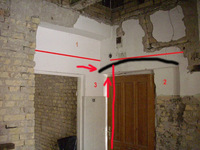 Akkor tudod benthagyni a boltivet, ha a 3-as jelnél raksz a fal mellé egy pillért (áthidaló minimum felfekvése 10-12 cm, tehát legyen minimum 20 cm, de ha van helyed, akkor jobb a 25, ami egésztégla már), amire feltámaszkodnak az ottani áthidalók. Ha a boltivet vésed, akkor azt ki kell váltani áthidalóval, és bonyolulttá teszi az egészet.
