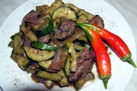 Hozzávalók: 4 db kisebb cukkíni 60 dkg csirkemáj 2 fej vöröshagyma 2 gerezd fokhagyma 2 evőkanál világos szójaszósz 1 evőkanál rizsbor (elhagyható) 1 teáskanál gyömbér 1 teáskanál citromfű 1 teáskanál majoranna chili bors, só