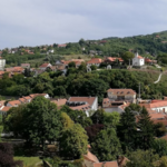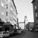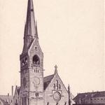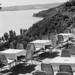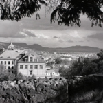 Esztergom, kilátás a Bazilika elől, előtérben a tanítóképző épülete (ma Pázmány Péter Katolikus Egyetem), hátrébb a Fájdalmas Szűz-kápolna a Szent Tamás-hegyen