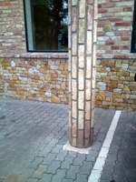 eléggé hátborzongató, mindenesetre felhívja magára a figyelmet (egy parkolóban áll két oszlop, a tetején egy orvosi rendelőt reklámozó tábla). a színekért a mobiltelefon fényképezőgépe a felelős, valójában ugyanazzal a téglával burkolták. (azért jutott eszembe lekattintani, mert pár napja keresett valaki profilos dísztéglát faoszlop burkolásához.)