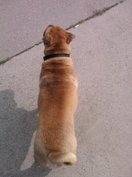 Na jó, anya ezzel a képpel meggyőzött! Ha már ebben a szokásos pózban is kisebb a fejem, mint a testem....mint egy szúnyognak! Azt mondta anya, hogy szülinapomra rendbe hozza a dolgot....Hát mit mondjak, ajiba egy velős csontnak jobban örülnék, mint egy hónapos fitness programnak!