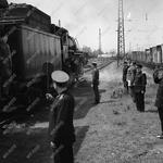 A jelentés szerint a 3448 sz. személyvonatot a 375,802 psz., a 3479 sz. tehervonatot a 342,153 psz. gép továbbította, utóbb ismeretlen sorozatú tológéppel. Az ütközés az állomás III. sz. vágányán történt, hibás váltóállítás miatt. A tehervonat mozdonyára a D 60164 psz. kalauzkocsi felpattant, ez nyomta össze a konyhát, ahogy a képen is látható. A következő fotón a felborult, cementtel rakott G kocsi pályaszáma 131248. A vonat Iz 330160 sz. szénnel rakott és súlyosan rongálódott kocsijáról nincs fotó, ahogy - szerencsére - az ennek fékülésén tartózkodó fékezőről sem, aki azonnal meghalt a balesetben. A személyvonat mozdonya, D 65142 sz. kalauz-, és Fk 807 sz. postakocsija súlyosan sérült, ezek láthatóak is a fotókon. A vonat többi sérült kocsijáról (31121 B; 52474 C; 52221 C; 50398 C) nincs felvétel.