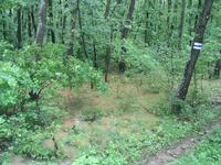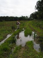 Pedig a neheze még csak ezután következett! Irota felé nyílt terepen indultunk, ahol néhány kőre és bokorra festett jelzés mutatta az utat (itt kicsit figyelni kell) utána erdőben kellett mennünk a Kecske pad felé. Itt már jócskán kerülgetni kellett a tócsákat, amik helyenként meghaladták az út méreteit is. A Kocsma-lápa után egy nagy tarvágáshoz értünk, ahol egy ág takarásában, egy hagyásfán láttuk a helyes útra (azaz keresztül át) vezető jelzést. Akkor bizonytalanodtunk el, amikor a bal oldalon elért fákon egyetlen jelet sem találtunk. Némi keresgélés után kiderült, hogy mégis ez a jó irány, már majdnem a tisztás túlsó oldalánál megleltük a következő jelzést (hogy előtte miért nincs, rejtély). Innen pár lépés múlva egy újabb tarvágáshoz értünk, már majdnem elcsábított a széles út, mikor emlékezve Fgg útmutatására, Felazso jobbra lent meglátott két derékban kivágott fán „valami légypiszkot”. A fényképezőgépet távcsőnek használva kiderült, hogy azok jelek :) (a 2003-as C atlaszban már ez az út szerepel)