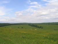 A széles réten vezet egy szekérút, majd balról érkezik egy másik, a kerítés mellett, valahol az Őzfej nevű 328-as csúcsnál.