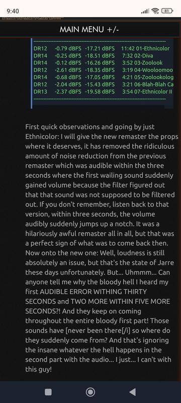 Még ugyanezen a Zoolook fórumon persze arra is rájönnek, meg más helyeken is, hogy egyszerűen csak annyi történt, hogy az eredeti szalagokat használták fel ehhez, ami sajnos károsodott az elmúlt 40 év alatt. Ezt cáfolhatatlanul bizonyítja, hogy a 2015-ös remaster legzavaróbb hibája, hogy az Ethnicolor két része között kihagyás/akadás volt, most eltűnt és megint úgy hangzik, mint az eredetin. Szóval nem a mastering folyamat vagy a kódolás közben keletkeztek a hibák. Ha már kritizálunk, akkor úgy korrekt, ha a teljes képet nézzük. (Csak akkor ugye nehezebb technofóbosokni.) Meg azért látom olyan hozzászóló is előbújt a barlangjából, aki évek óta nem ír ide semmilyen koncert vagy album vagy interjú vagy bármi alkalmából, de ezért a sebesült vadra azonnal lecsap. Nem baj, jó tudni, hogy mindig olvassa, amiket írok a Starmus koncertről, Electronica-ról, Oxymore-ról, stb.-ről. :)